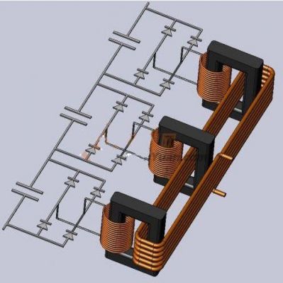 這種方式的電路示意圖如圖4所示。為了能看的直觀一些,這里畫了一張3D的圖紙,為了畫出這個(gè)示意圖,畫了好長時(shí)間,特別是初級的那個(gè)線圈,看上去簡單,很費(fèi)了一番力氣!這種結(jié)構(gòu)的特點(diǎn)是多個(gè)變壓器組合,初級為串聯(lián)結(jié)構(gòu),次級獨(dú)立整流以后再串聯(lián)。優(yōu)點(diǎn)是:適合大功率的輸出,變壓器的升壓比不大。缺點(diǎn)是:初、次級對磁芯之間總有一個(gè)絕緣要求高,需要多個(gè)變壓器。
