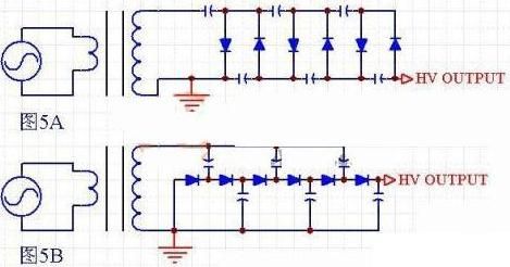 例如抽頭式雙半波可以拓展為抽頭式全波正負(fù)多倍壓電路,用以得到正負(fù)高壓。也可以把圖5B的結(jié)構(gòu)和圖5A的結(jié)構(gòu)混合起來使用。也可以把常規(guī)整流方式與倍壓整流方式混合使用。正負(fù)倍壓方式中,也可以正、負(fù)階數(shù)不一致。很多場合,我們把變壓器和整流電路兩種解決手段同時(shí)組合使用,例如變壓器次級分段,每段分別全波倍壓后串聯(lián)輸出等等。