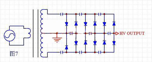 電路結(jié)構(gòu)見圖7,這種結(jié)構(gòu)的特點(diǎn)是高壓變壓器的次級帶中間抽頭。這種結(jié)構(gòu)的優(yōu)點(diǎn)是:倍壓的電壓跌落比半波多倍壓方式小很多。紋波也小很多。缺點(diǎn)是:變壓器的次級需要抽頭,輸出同樣的高壓,變壓器的次級匝數(shù)增加了一倍。元件多,成本高。