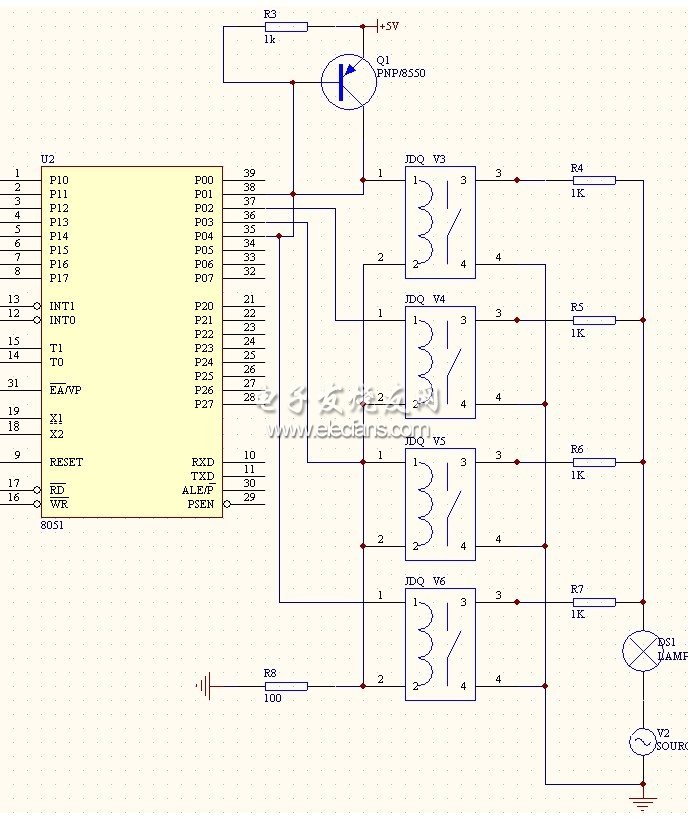 接收電路和調(diào)光電路的實(shí)現(xiàn)均是通過繼電器實(shí)現(xiàn)的,給每一個繼電器串聯(lián)一個電阻,構(gòu)成一個回路,本電路將四個繼電器回路并聯(lián),連接在P0 口上,當(dāng)四個繼電器均閉合時,燈最亮,當(dāng)三個繼電器工作時,燈較亮,當(dāng)兩個繼電器工作時燈次亮,當(dāng)一個繼電器工作時,燈最暗,當(dāng)四個繼電器都不工作時,燈泡處于關(guān)閉狀態(tài)。接收電路圖如圖6 所示: