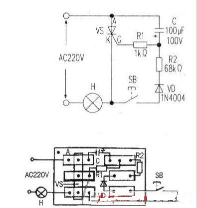 平時(shí)按鈕SB斷開,燈泡H熄滅。按一下SB.市電便經(jīng)SB、二極管VD、電阻R2向電容C快速充電.SB松開后.C經(jīng)電阻Rl放電使可控硅vs導(dǎo)通,H點(diǎn)亮。延時(shí)1分鐘左右,H熄滅。欲改變延時(shí)時(shí)間,可適當(dāng)增加或減小C的容量vs可選用單向可控硅(1A/400V)。