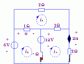 解之得:i1=3.6A, i2=2.8A, i3=4.4A,u=3(i3-i2)=4.8V,u1=11V。 |