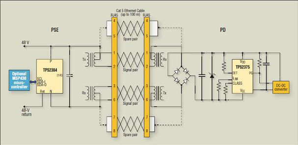 圖1、在本單端口 PoE 應(yīng)用例子中,通過以太網(wǎng)線纜的信號(hào)對(duì)實(shí)現(xiàn)了電源供電;而通過備用雙絞線對(duì)實(shí)現(xiàn)了更多電力供應(yīng)。