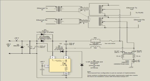 在使用 RJ-45 線纜的應(yīng)用中,通常不會(huì)使用先前提到的線纜屏蔽保護(hù)技術(shù)。不過,圖 3 中顯示的解決方案對(duì) PSE 集成電路實(shí)施了充分的保護(hù)。當(dāng)使用 AC 斷接電路時(shí)可采用該電路,若沒有使用該電路,則不需要 D1 和 D3。