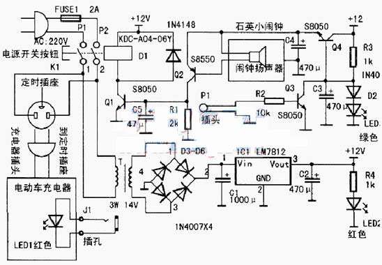 220V交流電源另一路經(jīng)定時插座加到充電器,當充電器還未轉(zhuǎn)入浮充充電狀態(tài)時,充電器的紅燈LED1得電發(fā)光。LED1兩端的2V電壓經(jīng)插孔J1、插頭P1、電阻R2加到Q3基極,使Q3飽和導通,將2.1V穩(wěn)壓調(diào)整管Q4基極短路到地,穩(wěn)壓調(diào)整管Q4截止,石英小鬧鐘則無直流電源供給而不工作,當充電器轉(zhuǎn)入涓電流浮充充電階段時,充電器紅色二極管LED1兩端變?yōu)榱汶妷合?充電器綠色二極管則發(fā)光),此時Q3也因基極零電壓而截止,電源調(diào)整管Q4則正常導通輸出2.1V直流電源,石英小鬧鐘則得電開始計時,當計時到預先設(shè)定值時,石英小鬧鐘則輸出低電平音頻脈沖訊響信號到Q2的基極,該低電平音頻脈沖信號通過Q2放大整流后再經(jīng)電容C1濾波輸出一直流電壓,使Q1飽和導通,開關(guān)K1電磁脫鉤線圈則得電產(chǎn)生磁力而使開關(guān)按鈕脫鉤跳開而斷開交流電源而實現(xiàn)自動結(jié)束充電。