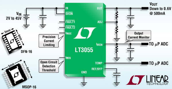 LT3055采用熱增強型16 引線 3mm x 4mm DFN 和16 引線 MSOP 封裝,兩種封裝均有緊湊的引腳布局。E 和I 級版本在 -40°C 至 +125°C工作結(jié)溫范圍內(nèi)工作,MP 級版本在 -55 至 +150°C范圍內(nèi)工作 (僅 MSOP 封裝),而 H 級版本則在 -40°C 至 +150°C范圍內(nèi)工作 (僅 MSOP 封裝)。所有器件皆有現(xiàn)貨供應(yīng)。E 級版本的千片批購價為每片 2.20 美元。