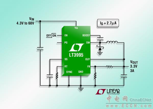 Linear推出靜態(tài)電流只有 2.7µA 的 3A、60V 降壓型開關(guān)穩(wěn)壓器 LT3995。該器件的 4.3V 至 60V輸入電壓范圍使其非常適用于汽車、商用車輛、航空電子和工業(yè)等應(yīng)用。其內(nèi)部的 4.7A 開關(guān)在電壓低至 1.2V時能提供高達 3A 的連續(xù)輸出電流。LT3995 的突發(fā)模式 (Burst Mode®) 工作可提供超低的靜態(tài)電流,從而使其非常適用于汽車或工業(yè)系統(tǒng)等應(yīng)用,而這類應(yīng)用要求“始終保持接通”運作和最佳的電池工作壽命。
