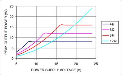 MOSFET輸出級(jí)的導(dǎo)通電阻會(huì)影響它的效率和峰值電流能力。降低負(fù)載的峰值電流可減少M(fèi)OSFET的I2R損耗,進(jìn)而提高效率。要降低峰值電流,應(yīng)在保證輸出功率,以及D類放大器的電壓擺幅以及電源電壓的限制的條件下,選擇最大阻抗的揚(yáng)聲器,如圖5所示。本例中,假設(shè)D類放大器的輸出電流為2A,電源電壓范圍為5V至24V。電源電壓大于等于8V時(shí),4的負(fù)載電流將達(dá)到2A,相應(yīng)的最大連續(xù)輸出功率為8W。如果8W的輸出功率能滿足要求,則可以考慮使用一個(gè)12揚(yáng)聲器和15V供電電壓,此時(shí)的峰值電流限制在1.25A,對(duì)應(yīng)的最大連續(xù)輸出功率為9.4W。此外,12負(fù)載的工作效率要比4負(fù)載的高出10%到15%,降低了功耗。實(shí)際效率的提高根據(jù)不同D類放大器而異。雖然大多數(shù)揚(yáng)聲器的阻抗都采用4或8,但也可采用其他阻抗的揚(yáng)聲器實(shí)現(xiàn)更高效的散熱。