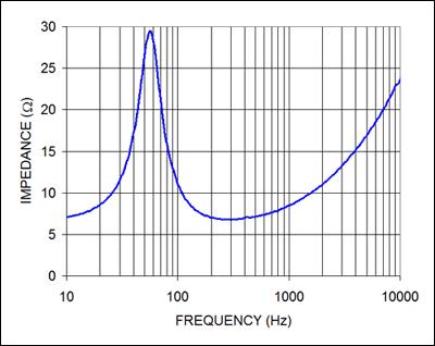 圖6. 8阻抗、13cm口徑揚(yáng)聲器的阻抗隨頻率改變而急劇變化
