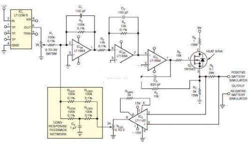 本例中的電池模擬器復(fù)制了電池的ESR響應(yīng)曲線。如果你在反饋網(wǎng)絡(luò)中安排不同值,那你就能獲得各種ESR曲線。該電路可模擬大部分電池類型,其中包括鋰離子電池和堿性電池。它為受測設(shè)備支持0.5V至4.2V的數(shù)安培電流,并能模擬多種電池的ESR.你可以設(shè)置ESR電位計,來把延時改變?yōu)镋SR的最終值。某些電池類型表現(xiàn)出這一獨特的特征。對于向負載提供脈沖電流的工作,它具有很大的影響。
