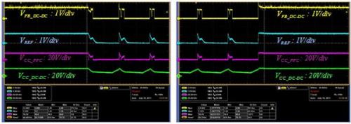 在無負(fù)載條件下,當(dāng)反激轉(zhuǎn)換器的反饋電壓下降時(shí),PFC級(jí)的電源電壓被切斷,PFC控制器停止工作。圖2顯示負(fù)載從滿負(fù)載到無負(fù)載,再到滿負(fù)載過程 中的工作波形。一旦第二級(jí)反激轉(zhuǎn)換器進(jìn)入間歇工作,PFC級(jí)便進(jìn)入間歇工作模式,并與反激轉(zhuǎn)換器同步停止間歇工作模式。通過對(duì)PFC級(jí)執(zhí)行間歇工作,可以 消除可能引起潛在問題的大浪涌電流,并且大幅降低待機(jī)功耗。為了評(píng)測(cè)PFC級(jí)的間歇工作,使用FAN7930臨界導(dǎo)通模式PFC控制器、帶間歇工作功能的 準(zhǔn)諧振反激控制器FAN6300A以及所提議的PFC控制電路,設(shè)計(jì)了一個(gè)用于LED街燈的的120W(48V/2.5A) LEB-016演示線路板。如圖2所示,建議的電路工作出色。表1所示為在各種輸入線路電壓下的待機(jī)功耗測(cè)量值?梢宰C明:在寬泛的輸入范圍內(nèi),可以使待 機(jī)功耗降低80%以上。還可以在高線路輸入電壓下獲得低于0.3W的待機(jī)功耗。
