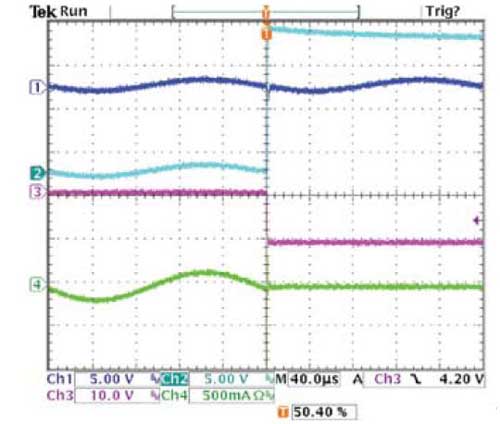 圖2的波形顯示了一個操作電路。放大器的輸出之一(軌跡1)是一個偏置2.5V直流1kHz的正弦波。軌跡2是線束信號。它開始也是一個偏置為2.5V,1kHz的正弦波,但在200µs時,短接到一個18V電源上。軌跡3是分流調(diào)節(jié)器的輸出,最初偏置是11V,但被拉到地來響應(yīng)過壓狀態(tài)。軌跡4是線束的電流。起初為正弦波,該電流在響應(yīng)過載電壓時降至零。
