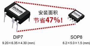 AC/DC一般多采用平面型MOSFET,因散熱問題而較難實(shí)現(xiàn)小型化。此次,羅姆采用了自產(chǎn)的超級結(jié)MOSFET。通過內(nèi)置多種保護(hù)功能減少了外置部件數(shù)量。8W級別以下的產(chǎn)品,除了標(biāo)準(zhǔn)的DIP7封裝,又新增了可表面貼裝的SOP-8封裝產(chǎn)品。采用SOP-8封裝(6.2mm×5.0mm×1.5mm)產(chǎn)品,安裝面積可節(jié)省47%,不僅能使配套產(chǎn)品更加小巧,而且設(shè)計(jì)和基板布局也更加簡單。