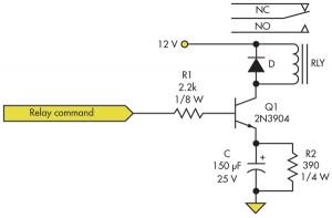 繼電器驅(qū)動晶體管的發(fā)射級接地,我們加上的電阻和電容打斷它。當驅(qū)動晶體管是關(guān)斷時,R2保證電容放電,當繼電器打開驅(qū)動晶體管時,電容相當于一個短路,使最大電流通過繼電器線圈,并保持閉合。