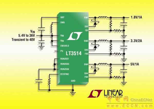 LT3514 的開關(guān)頻率可由用戶編程在 250kHz 至 2.2MHz,且在整個(gè)頻率范圍內(nèi)是可同步的,從而使設(shè)計(jì)師能優(yōu)化效率,同時(shí)避開了關(guān)鍵的噪聲敏感頻段。其 28 引線 4mm x 5mm QFN 封裝和高開關(guān)頻率允許使用小型的外部電感器和電容器,可為多輸出應(yīng)用提供占板面積緊湊和熱效率很高的解決方案。