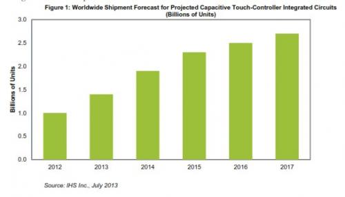 圖1:全球投射電容觸摸控制器IC出貨量預(yù)測(cè) (以10億計(jì))