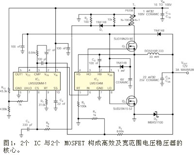 圖1所示電路采用美國國家半導體公司 (National Semiconductor) 的LM5020型電流模式PWM IC來驅(qū)動 LM5104 的柵極驅(qū)動器IC2, 以形成一個同步控制器。LM5020 包括一個可承受最高100V輸入電壓的內(nèi)部線性穩(wěn)壓器,并可提供為LM5104供應(yīng)驅(qū)動電流的輸出。為降低高輸入電壓下的功耗,在起始功率加上后,1N4148 型二極管D2為電路其他部分提供一個11.5V的自舉電壓。由Pulse Engineering公司提供的100比1電流變壓器T1在MOSFET Q1導通期間提供電流反饋。Q1與 Q2均為具有低柵極電荷要求與低導通阻抗的 Siliconix Dpak 器件,用來減小電路在 200kHz 工作頻率上的總開關(guān)損耗。所有電容器均采用 陶瓷介質(zhì)結(jié)構(gòu)的,以承受高溫并滿足封裝尺寸的制約。
