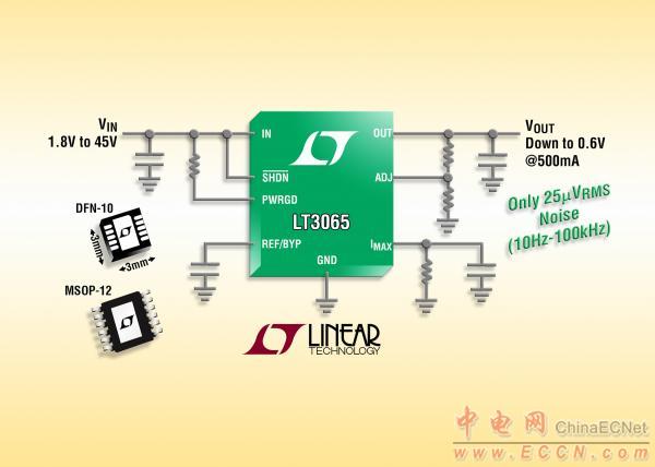 Linear推出高電壓、低噪聲、低壓差線性穩(wěn)壓器 LT3065,該器件可提供精準、可編程電流限制和電源良好標記。LT3065 在滿負載時可傳送高達 500mA 輸出電流和具有一個 300mV 壓差。該器件具有 1.8V 至 45V 的寬輸入電壓范圍,輸出電壓在 0.6V 至 40V 范圍內(nèi)可調(diào)。單個 REF/BYP 引腳電容器實現(xiàn)低噪聲工作,在 10Hz 至 100kHz 帶寬內(nèi)僅為 25µVRMS,還提供了基準軟啟動功能,從而在接通時防止輸出電壓過沖。輸出電壓容限非常準確,在整個電壓、負載和溫度范圍內(nèi)為 ±2%。