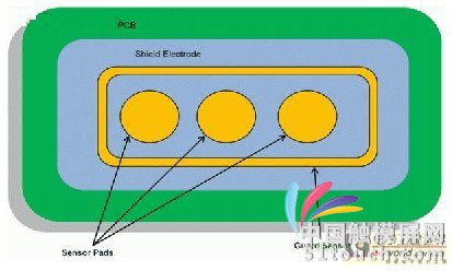 【導(dǎo)讀】: 基于電容式感應(yīng)技術(shù)的按鍵使電器外形時尚美觀,消除了磨損問題,與機械按鍵相比更受歡迎。許多電器都要在靠近液體的環(huán)境下使用,因此要考慮防水功能,避免水濺上去而產(chǎn)生錯誤的按鍵觸發(fā)。圖2給出了電容式傳感器印刷電路板(PCB)的典型布局。通過連接保護電極可實現(xiàn)防