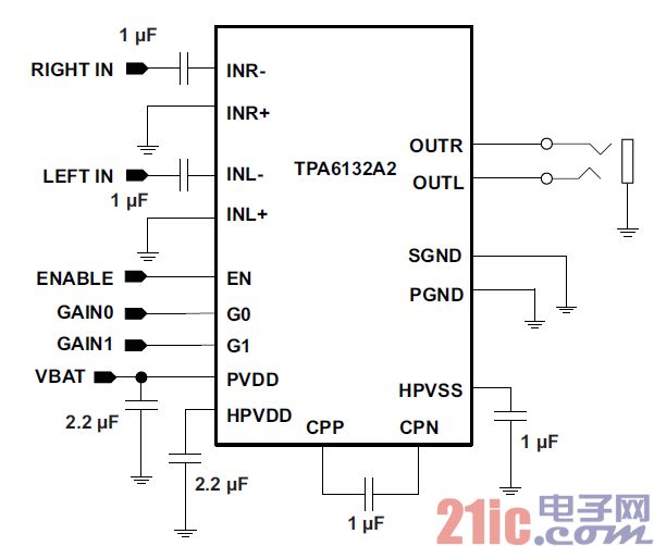 TI 提供的TPA6132A2,因?yàn)槠?00dB 的高信噪比,0.01%的低失真度,出色的消除POP 聲的能力,以及極高的性價(jià)比,在手機(jī)等移動(dòng)設(shè)備中,得到了廣泛的應(yīng)用。由于移動(dòng)設(shè)備芯片的集成度的提高,越來越多的芯片組選擇了單端的連接方式作為耳機(jī)通道的輸出。