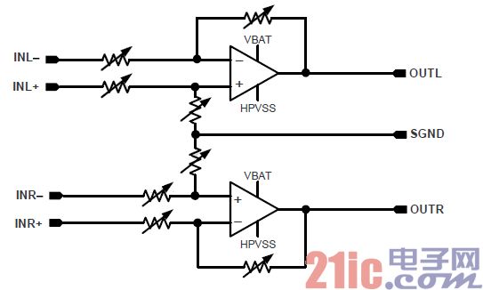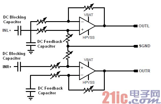 因?yàn)槎鷻C(jī)對(duì)于放大器直流分量過于敏感,且HPVSS 并不完全對(duì)稱與VBAT,因此需要引入直流反饋來減小輸出的直流分量,因此需要將INL-和INR-通過一個(gè)直流反饋電容接地。而由于前端芯片輸出一般都有較高的直流分量,因此需要在INL+和INR+端接入隔直電容。