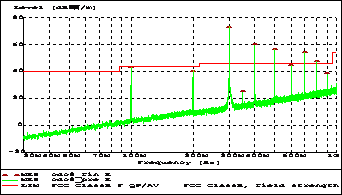 由于兩個(gè)原因,時(shí)鐘信號(hào)常歸咎于 EMI。即使時(shí)鐘低頻率運(yùn)行,較好的時(shí)鐘上升/下降沿也包含大量的奇次諧波,其在更高頻率時(shí)會(huì)引起 EMI。另外,時(shí)鐘通常會(huì)在板上傳播一段較長(zhǎng)的距離,從而更可能給其他組件帶來(lái)干擾。通常,EMI 可通過(guò)頻譜分析儀測(cè)量,如圖 1 所示。圖中,綠色信號(hào)存在一些超出紅色 FCC 屏蔽的頻率分量(300MHz、400MHz 和 500MHz 等)。