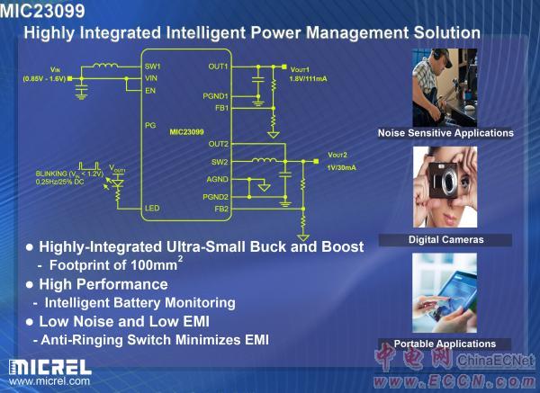 麥瑞半導(dǎo)體負(fù)責(zé)高性能線性和電源解決方案營銷的副總裁Brian Hedayati表示:“MIC23099是高性能、高集成度電源管理解決方案,解決了對噪聲敏感和空間有限的便攜式應(yīng)用的技術(shù)難題。該器件將整個解決方案的尺度縮小了40%以上,內(nèi)置的智能電源監(jiān)測功能進(jìn)一步降低了系統(tǒng)設(shè)計的復(fù)雜性!