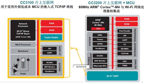 CC3100是一個(gè)片上的Wi-Fi平臺(tái),可以與外部一些低成本的MCU如MSP430結(jié)合起來(lái)開(kāi)發(fā)一個(gè)物聯(lián)網(wǎng)的應(yīng)用,而CC3200是將Wi-Fi處理器與一個(gè)基于ARM Cortex-M4 MCU集成在一起的片上平臺(tái),具有更多外設(shè)和接口,可以直接用于開(kāi)發(fā)一個(gè)物聯(lián)網(wǎng)產(chǎn)品。