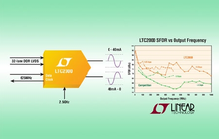Linear推出 16 位 2.5Gsps 數(shù)模轉(zhuǎn)換器 (DAC) LTC2000,該器件具出色的頻譜純度,在 200MHz 輸出時 SFDR 為 74dBc,輸出頻率從 DC 至 1GHz 時 SFDR 優(yōu)于 68dBc,這比同類的 14 位 DAC改進了 12dB。LTC2000 具低相位噪聲和很寬的 2.1GHz -3dB 輸出帶寬,在高端儀表、寬帶通信、測試設備、有線電視 DOCSIS CMTS 以及雷達應用中,能夠?qū)崿F(xiàn)寬帶或高頻 RF 合成。