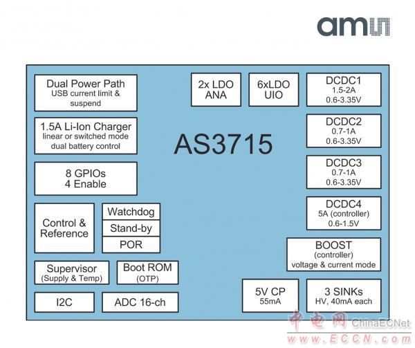 新的AS3715包含所有鋰電池驅動手持設備電源解決方案所必不可少的電源管理構件,包括運動攝影相機、導航設備、平板電腦、媒體播放器以及游戲操縱桿等。