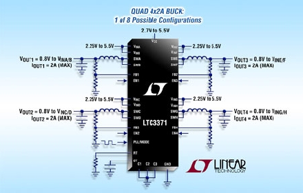 Linear推出高度集成的通用型電源管理解決方案 LTC3371,以用于需要多個低壓電源的系統(tǒng)。該器件具有四個同步降壓型轉換器,各由獨立的 2.25V 至 5.5V 輸入供電,而且均可通過配置以共享 8 個可用 1A 功率級中的最多 4 個。利用 8 種獨特的輸出電流配置,LTC3371提供了實質的靈活性以及容易重復使用于不同應用中。該器件是多種多通道工業(yè)、汽車、通信和分布式電源系統(tǒng)的理想選擇。
