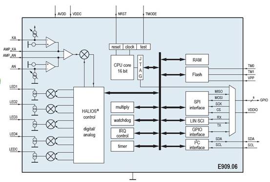 在原理上,E909.06的光電傳感器系統(tǒng)-HALIOS™(High Ambient Light Independent Optical System)首先向外發(fā)射經(jīng)過調(diào)制的紅外光,然后經(jīng)過外界物體(如手勢(shì))反射回來給光電二極管,這個(gè)二極管再把光信號(hào)轉(zhuǎn)換成電信號(hào)和另外一路補(bǔ)償管的信號(hào)進(jìn)行比較之后傳給芯片,E909.06再根據(jù)這個(gè)信號(hào)的變化趨勢(shì)以及變化量來識(shí)別外界手勢(shì)的變化。這個(gè)方案最大的特點(diǎn)是不受外界環(huán)境光的干擾,并且可以實(shí)現(xiàn)自校準(zhǔn)的功能,消除由于傳感器表面存在劃痕、灰塵等的干擾。