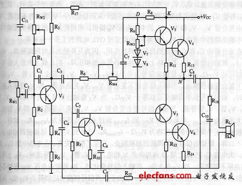 推動(dòng)級(jí)由V2管,R6,RW4,R7,R8,R9,V7管,V8管,RW3,R10,C5,C6,C7組成,連接成共發(fā)射極分壓式偏置穩(wěn)定電路。它承擔(dān)向功率輸出級(jí)提供足夠的推動(dòng)電流的任務(wù)。推動(dòng)級(jí)功率輸出級(jí)采用直接耦合方式。