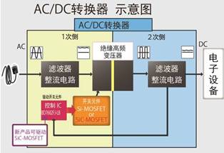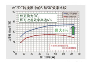 在高耐壓范圍中,SiC-MOSFET與Si-MOSFET相比,具有“開關損耗與導通損耗少”、“可支持大功率”、“耐溫度變化”等優(yōu)勢;谶@些優(yōu)勢,當SiC-MOSFET用于AC/DC轉(zhuǎn)換器和DC/DC轉(zhuǎn)換器等中時,可帶來更高的功率轉(zhuǎn)換效率、散熱器件的小型化、高頻工作使線圈更小等更節(jié)電、零部件數(shù)量更少、安裝面積更小等效果。