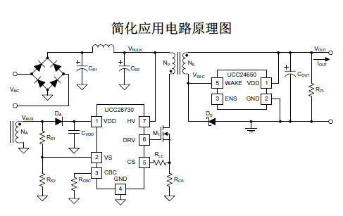 現(xiàn)有初級(jí)側(cè)穩(wěn)壓電源的主要設(shè)計(jì)局限在于如何在保持低待機(jī)功率的情況下,仍保證較高的瞬變響應(yīng)性能。UCC28730和UCC24650芯片集在盡可能提供最佳瞬變響應(yīng)性能的同時(shí),實(shí)現(xiàn)了零待機(jī)功耗。其中UCC24650不僅免除對(duì)光耦合器件和TL431等回饋組件的需要,從而降低了成本,而且其內(nèi)置喚醒控制器中的TI電壓偏低檢測(cè)功能還在保持窄輸出電壓穩(wěn)壓窗口(支持零到滿(mǎn)負(fù)載瞬變)的情況下,還可以應(yīng)用微型輸出電容器。