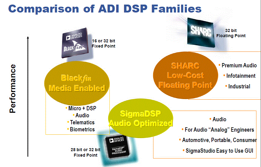 實(shí)際上,ADI針對音頻市場的不同要求,有著清晰的產(chǎn)品劃分。用在高端的是SHARC® DSP,用在中高端的是Blackfin® DSP家族,用在主流產(chǎn)品的是ADAU145x系列,入門級則由ADAU17xx擔(dān)當(dāng)。