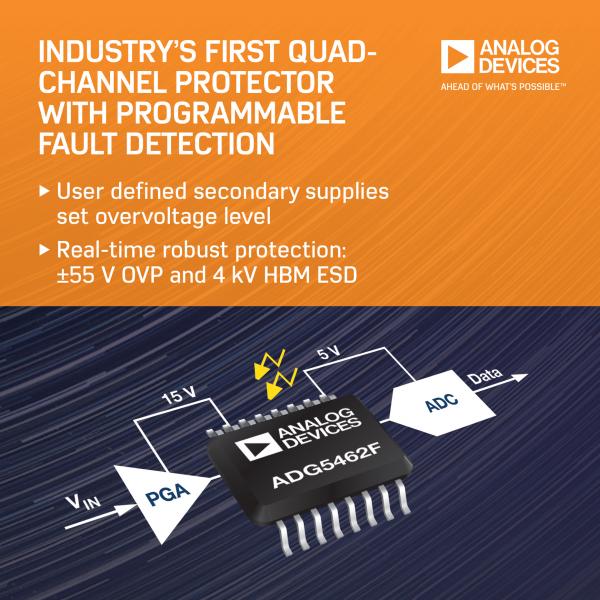 ADI全球領(lǐng)先的高性能信號(hào)處理解決方案供應(yīng)商,最近推出一款四通道保護(hù)器ADG5462F和兩款多路復(fù)用器ADG5248F、ADG5249F,其可提供+/-55-V過壓保護(hù)(OVP),適用于采用4.5V低壓至36V電壓的精密轉(zhuǎn)換器、放大器和其他器件。四通道保護(hù)器ADG5462F、8:1多路復(fù)用器ADG5248F和差分4:1多路復(fù)用器ADG5249F具有+/-55-V過壓引腳上電和關(guān)斷級(jí),可針對(duì)熱插拔和操作人員誤用事件提供魯棒的精密保護(hù),從而保障下游模擬器件的安全。利用片內(nèi)故障診斷,新器件成為業(yè)界首個(gè)能夠檢測(cè)并避免缺陷通道的產(chǎn)品,有利于簡化故障檢測(cè)算法并提升系統(tǒng)正常運(yùn)行時(shí)間。新產(chǎn)品允許用戶定義與主電源無關(guān)的故障觸發(fā)電平,最大程度地提高了設(shè)計(jì)靈活性。另外,由于不再需要多個(gè)分立保護(hù)器件,ADG5462F、ADG5248F和ADG5249F使PCB面積得到優(yōu)化,并且設(shè)計(jì)過程得以簡化。這些器件針對(duì)精密儀器儀表、過程控制和航空電子應(yīng)用進(jìn)行了優(yōu)化。