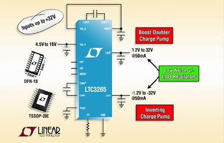 Linear推出高壓、高集成度、低噪聲雙輸出電源 LTC3265,該器件采用單個(gè)正輸入電源 (VIN_P),以及無(wú)需任何電感器就可產(chǎn)生高達(dá) ±2 • VIN_P 的低噪聲雙極電源軌。LTC3265 包括一個(gè)升壓倍增充電泵、一個(gè)負(fù)輸出充電泵和兩個(gè)低壓差 (LDO) 穩(wěn)壓器。升壓充電泵具有一個(gè) 4.5V 至 16V 的寬輸入范圍,可從其輸出 VOUT+ 給正 LDO 后穩(wěn)壓器供電。負(fù)輸出充電泵甚至具備更寬的輸入范圍 (4.5V 至 32V),該輸入可以連至升壓型輸入或輸出。負(fù) LDO 后置穩(wěn)壓器用負(fù)輸出充電泵的輸出 VOUT- 供電。LTC3265 非常適合各種需要用高壓輸入提供低噪聲雙極電源的應(yīng)用,例如工業(yè) / 儀表低噪聲偏置發(fā)生器、便攜式醫(yī)療設(shè)備和汽車信息娛樂(lè)系統(tǒng)。