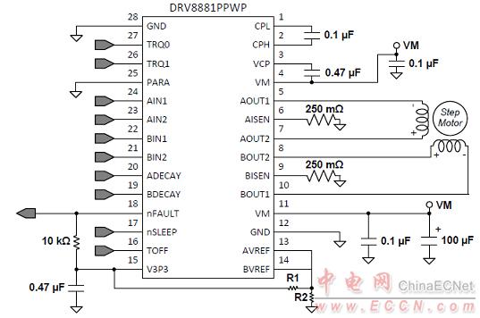 圖4。DRV8881P驅(qū)動(dòng)步進(jìn)馬達(dá)應(yīng)用框圖