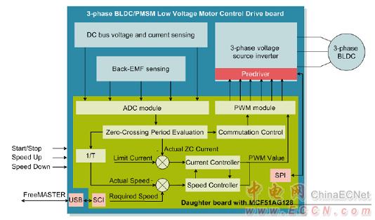 采用MCF51AG128無傳感器三相BLDC馬達演示板