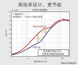 利用ROHM擅長的模擬設計技術優(yōu)勢,在80V級的DC/DC轉換器中實現了業(yè)界最高的功率轉換效率。與一般產品相比,功率效率最大可提高19%、穩(wěn)定運行時也可提高1.5%(按振蕩頻率300kHz、電源電壓48V、輸出電壓5V設定時)的電力效率,有助于實現工業(yè)設備的節(jié)能化。