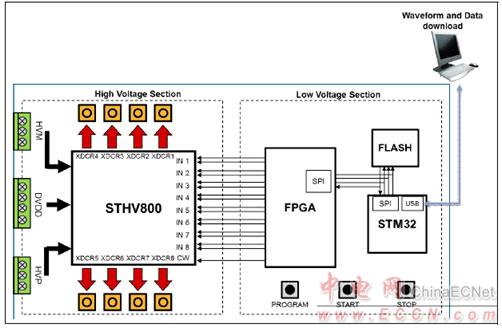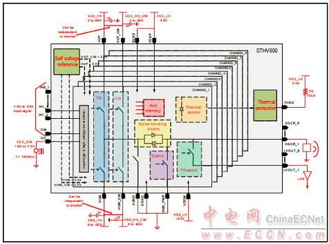 ST公司的STHV800是大容量超聲波發(fā)送器,每路有兩個(gè)獨(dú)立的半橋,輸出電壓0- ±90 V,輸出電流±2 A,由外部時(shí)鐘可同步輸入信號(hào),工作頻率高達(dá)20MHz,主要用在醫(yī)用超聲波圖像,脈沖波形發(fā)生器,NDT超聲波發(fā)送,壓電變送器驅(qū)動(dòng)等.本文介紹了超聲波系統(tǒng)框圖,STHV800主要特性,內(nèi)部框圖,評(píng)估板STEVAL-IME009V1主要特性,硬件框圖,電路圖和材料清單.