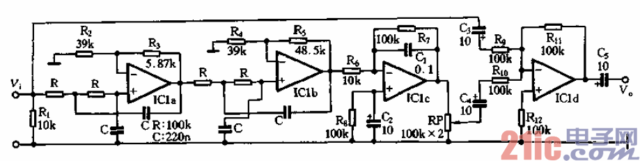 輸人信號經(jīng)ICl-a,ICl-b及外圍元件所組成的四階低通濾波器處理,其中心頻率為70Hz,衰減斜率為每倍額程24dB,增益為8.2dB。然后再由ICI-c組成的十倍緩沖放大器放大后輸出。被提升了的低頻信號與原始信號分別由白、C4送ICl-d混合處理后送人功率放大器。低頻信號與原始信號混合的量可由RP調(diào)節(jié),為了保證電位器RP關(guān)完后(低音信號混合量最。┰夹盘柕谋U娑龋琁Cl-d混合放大器的增益設(shè)計為OdBo