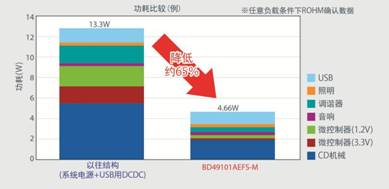 以往,高效率的DC/DC轉(zhuǎn)換器因外置部件較多而 存在成本高、安裝面積增大等問(wèn)題。但是,本產(chǎn)品優(yōu)化了系統(tǒng)整體的結(jié)構(gòu),通過(guò)DC/DC轉(zhuǎn)換器和線性穩(wěn)壓器的 最佳組合,將DC/DC轉(zhuǎn)換器控制在2通道輸出系統(tǒng)之內(nèi),大大改善了效率的同時(shí)還降低了成本。由此,大幅降低 工作時(shí)功耗較大的CD機(jī)械部和微 控制器等的功耗,實(shí)現(xiàn)了業(yè)界最低的運(yùn)行功率。