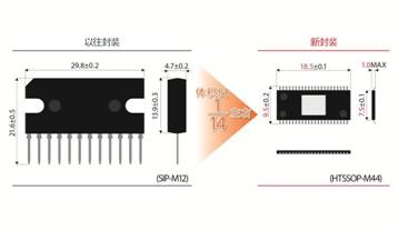 本產(chǎn)品通過(guò)采用DC/DC轉(zhuǎn)換器并優(yōu)化電源結(jié)構(gòu),使發(fā)熱量更低,實(shí)現(xiàn)了僅PCB板即可散熱的表面貼裝封裝(HTSSOP-A44)。由此,不再需要散熱板,與ROHM以往的產(chǎn)品相比,體積僅為1/14左右,有助于減少組裝工時(shí),并進(jìn)一步節(jié)省系統(tǒng) 內(nèi)部空間,降低設(shè)計(jì)負(fù)擔(dān)。