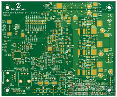 Microchip公司的MCP8025/6是三相無刷DC(BLDC)馬達(dá)柵極驅(qū)動器,包括有三個能驅(qū)動三個外接NMOS/NMOS晶體管對的半橋驅(qū)動器,在12V時可提供0.5A的峰值輸出電流.器件集成了比較器,降壓穩(wěn)壓器,兩個LDO穩(wěn)壓器,電源監(jiān)測比較器,超溫傳感器,LIN收發(fā)器,零交叉檢測器,中性模擬器和運(yùn)算放大器.主要用在汽車燃料泵,水泵和通風(fēng)馬達(dá),家用電器,PMSM控制,業(yè)余愛好飛機(jī),船和卡車.本文介紹了MCP8025/6主要特性,框圖和典型應(yīng)用電路,以及MCP8025 TQFP BLDC馬達(dá)驅(qū)動評估板主要特性,框圖,電路圖,材料清單和PCB設(shè)計圖.