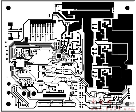 圖12. MCP8025 TQFP BLDC馬達(dá)驅(qū)動評估板PCB金屬層設(shè)計圖(底層) |