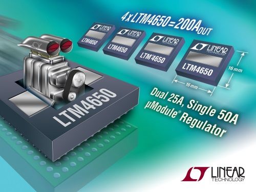| 凌力爾特公司 (Linear Technology Corporation) 推出雙輸出25A或單輸出 50A 降壓型微型模塊 (μModule) 穩(wěn)壓器LTM4650,該器件內(nèi)置了屏蔽的電感器、MOSFET和兩個DC/DC穩(wěn)壓器IC,全放在一個小型耐熱性能增強(qiáng)型塑料封裝中。該器件采用16mm x 16mm x 5.01mm BGA封裝,內(nèi)置了已獲專利的散熱器。該散熱器連接到MOSFET和電感器上,可從封裝內(nèi)部到封裝頂部快速散出熱量,而散熱器的表面則裸露于空氣中。通過空氣流動或者空氣流動加上連接外部散熱器,散熱性能可得到進(jìn)一步提高。當(dāng)沒有外部散熱器的情況下,在環(huán)境溫度高達(dá)71℃和200LFM氣流或環(huán)境溫度高達(dá)77℃和400LFM氣流時, LTM4650可從12VIN至0.9VOUT提供50A電流。