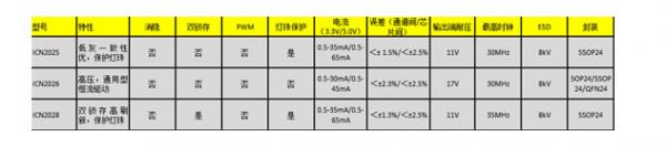 表1:恒流驅(qū)動ICN2025/26/28性能對比。