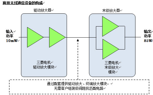 ・通過(guò)配套提供驅(qū)動(dòng)放大、末級(jí)放大模塊,無(wú)需客戶(hù)設(shè)計(jì)組裝級(jí)間阻抗匹配電路,有助于商用無(wú)線(xiàn)通信設(shè)備開(kāi)發(fā)的高效化